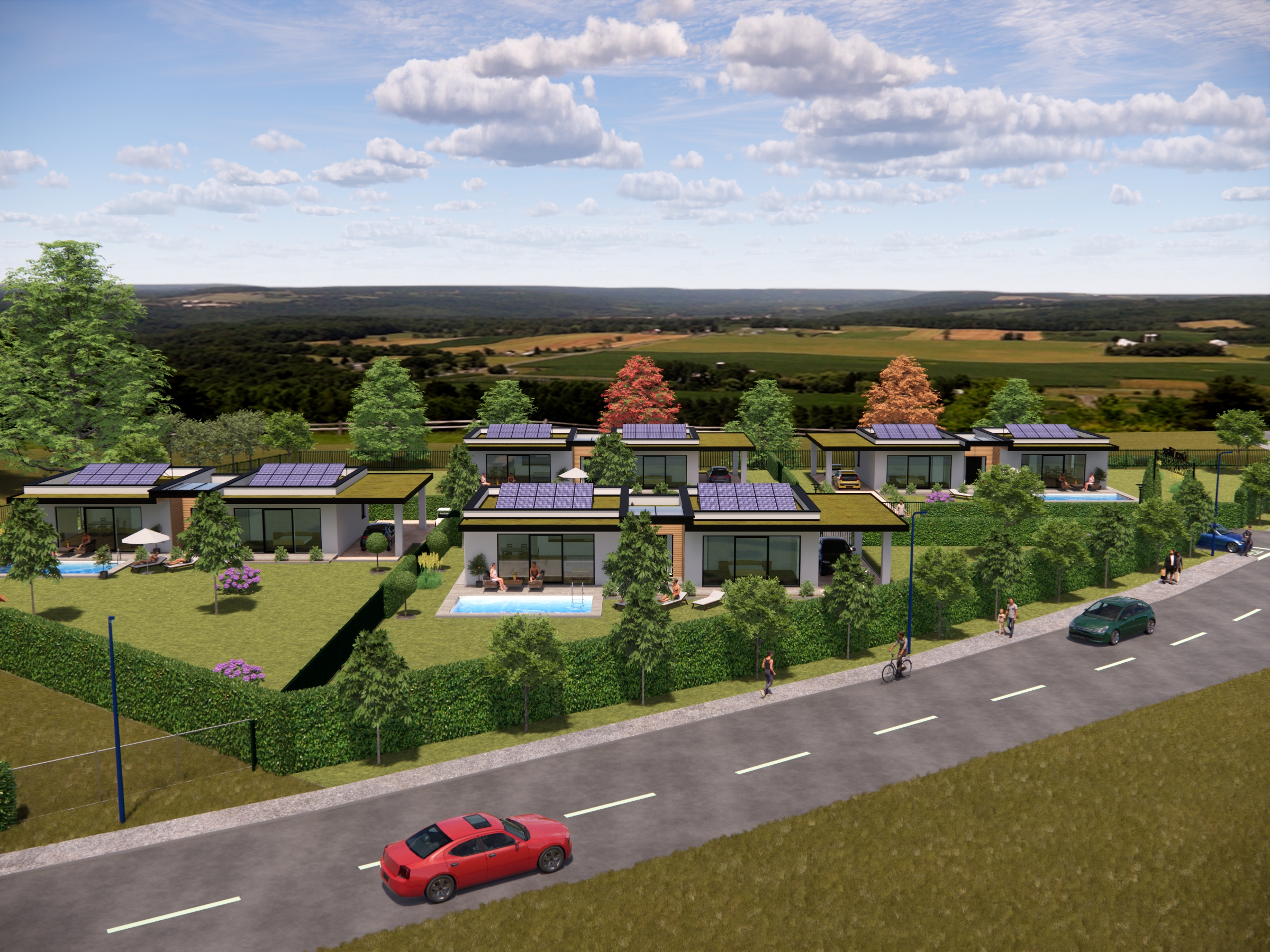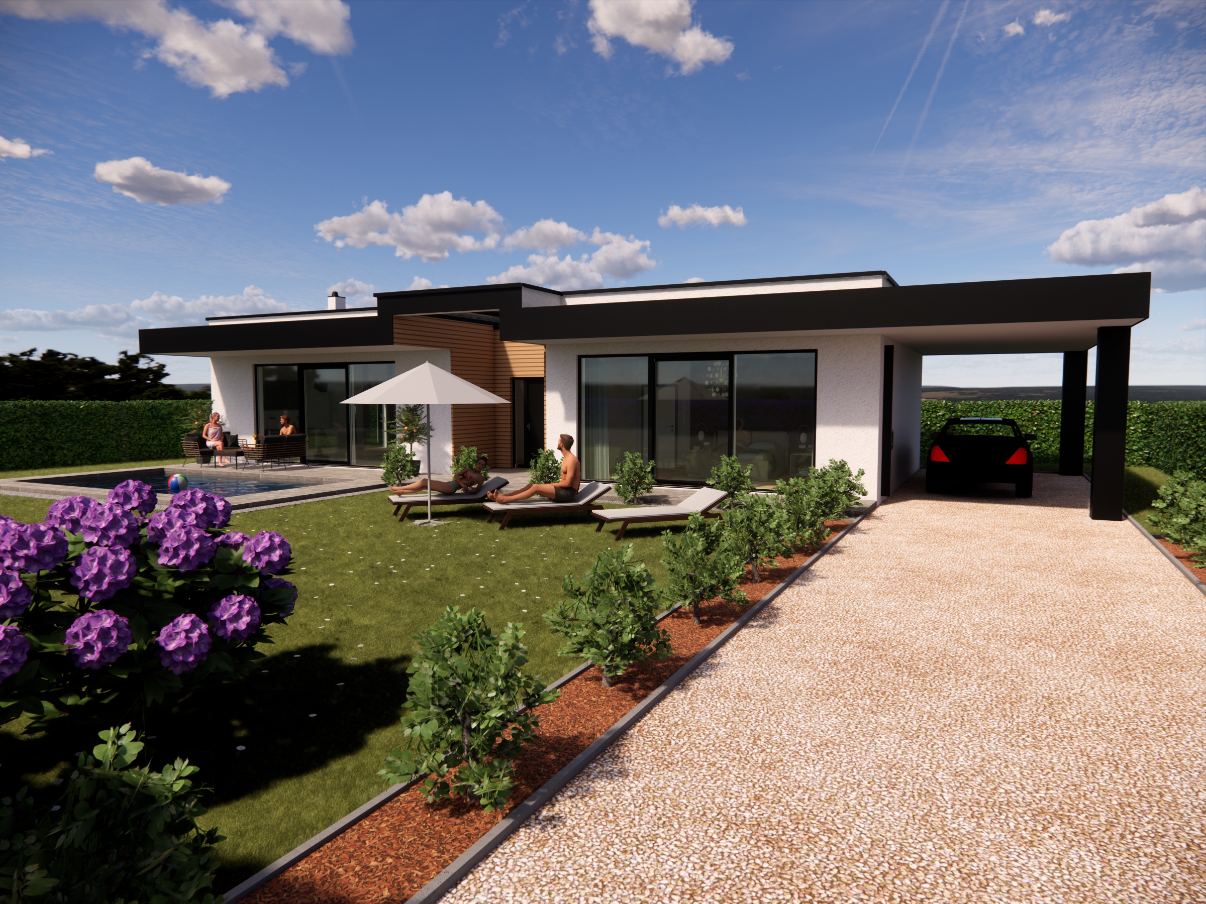 Dieses einzigartige Projekt inmitten beindruckender Natur, befindet sich in der Thermen- und Golfregion Stegersbach. Die Bungalows bilden sowohl als Einheit, als auch freistehend eine – auf den ersten Blick heterogene und gewachsene Ansiedlung. Beim genaueren Hinsehen werden sie jedoch durch die gemeinsame Formensprache zu einer zusammengehörigen Nachbarschaft verknüpft. In sehr ruhiger Umgebung steht Ihnen ein moderner Bungalow mit Carport auf einen ca. 1.102 m² großen, herrlichen Südgrundstück, zur Verfügung. Auf einer Wohnebene erwarten Sie zwei oder drei Zimmer, ein Tageslicht-Badezimmer, eine Küche mit Essplatz und ein WC, sowie ein großzügiger Wohnbereich mit einer überdachten Sonnenterrasse auf insgesamt ca. 109 m² Wohnfläche. Sämtliche Wohnräume haben Zugang zur großen Südterrasse. Das helle Wohn- und Esszimmer und die Schlafzimmer sind mit einer bodentiefen Hebe-/Schiebetür mit der ca. 55 m² großen Sonnenterrasse verbunden, die im Sommer Ihr zweiter Essplatz wird. Der herrliche sonnige Süd-Garten ist mit einer großen Rasenfläche und schattenspendenden Bäumen angelegt. Für Ihren PKW steht ein Einzel-Carport mit einer Größe von ca. 30 m² zur Verfügung, wo Sie auch eine Lademöglichkeit für Ihr E-Auto und Ihr E-Bike haben.